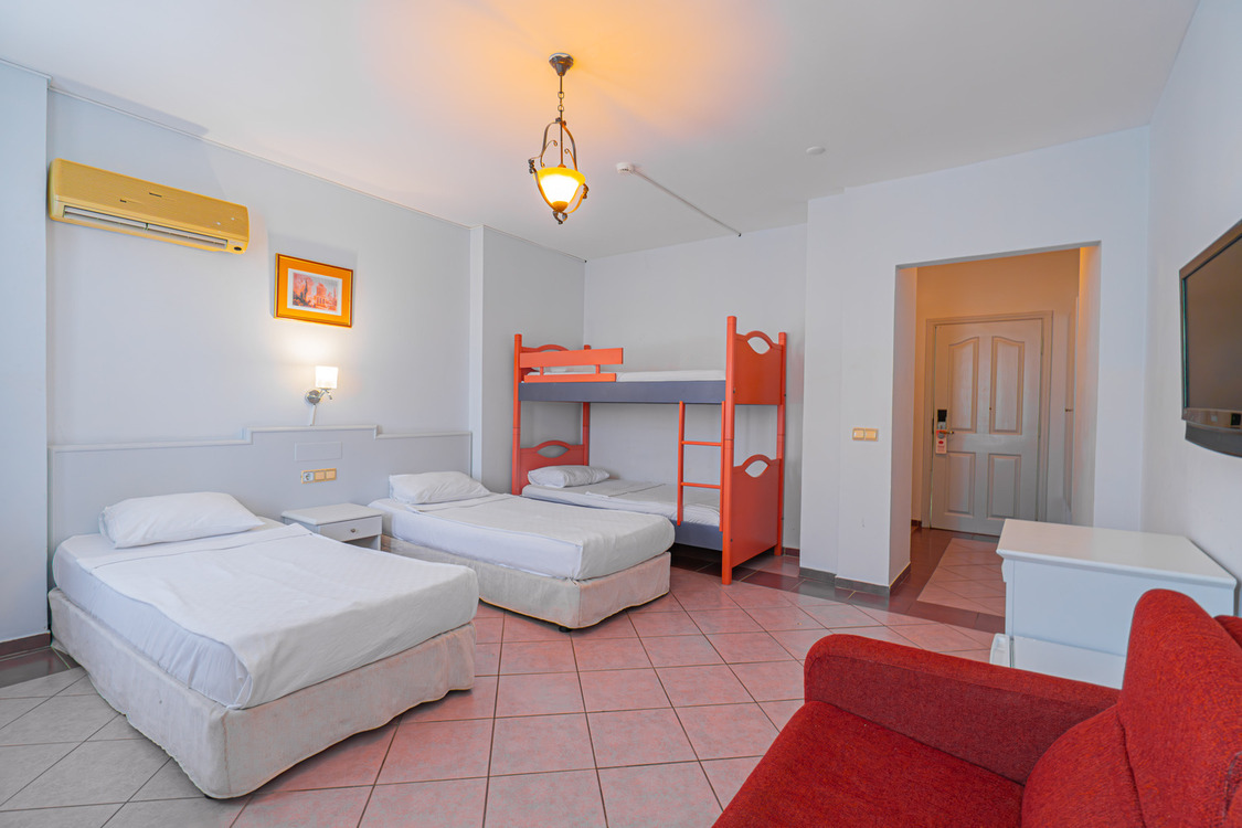 Özenle hazırlanmış ferah ranzalı odalarımızda, 4 yetişkine kadar rahatlıkla konaklayabilirsiniz. Bütün odalarımızda klima, LCD ekran televizyon ve mini bar bulunmaktadır.
